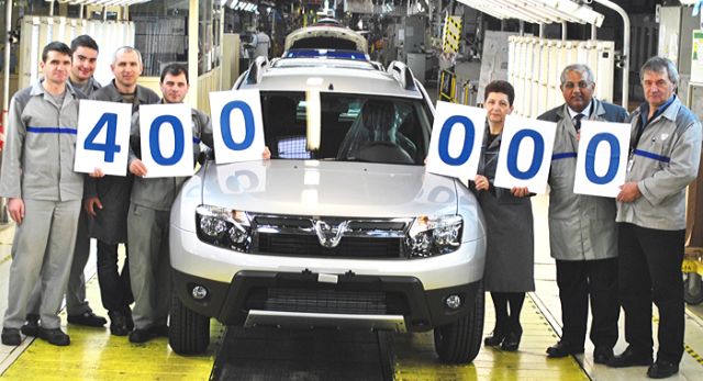 Potrivit unui comunicat de presă al producătorului, automobilul Dacia Duster cu numărul 400.000 fabricat la Piteşti este o versiune Laureate 4×4, de culoare gri platine, echipat cu motorul 1.5 dCi 110 CP şi va fi livrată unui client din Franţa, principala piaţă de export a mărcii Dacia.