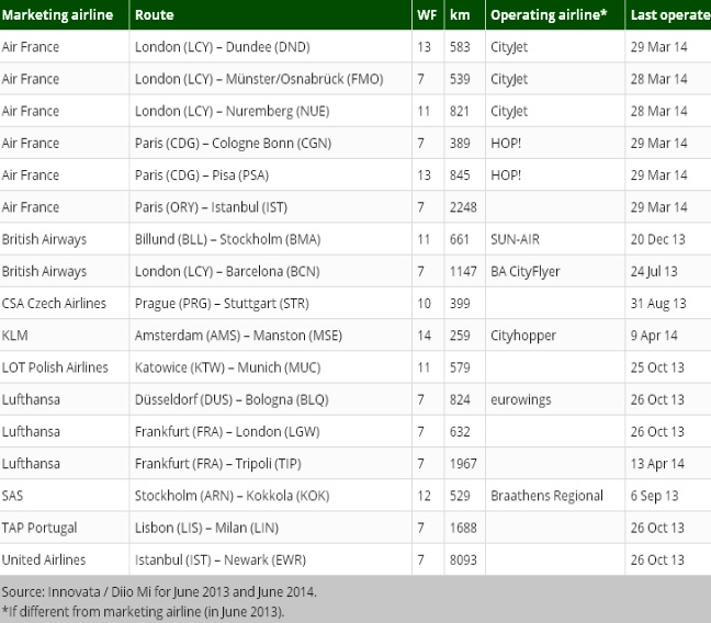 Aeroporturile europene au pierdut 40 de curse zilnice în mai puţin de un an, reiese dintr-o analiză realizată de Anna Aero, care a luat ca referinţă luna iunie 2013 faţă de iunie 2014. Dintre cele 40 de rute la care au renunţat companiile aeriene, doar una a fost luată de operatorul Twin Jet, Lyon-Stuttgart, abandonată de HOP!. Air France a tăiat rute pe aeroporturile din Londra şi Paris.