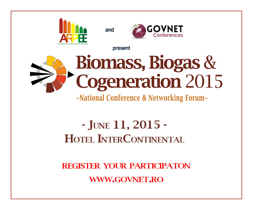 „Biomass, Biogas & Cogeneration 2015”, conferința națională consacrată energiei produse din biomasă, biogaz sau în centrale de cogenerare, organizată de Asociația Română pentru Promovarea Eficienței Energetice și GOVNET Conferences, va avea loc joi, 11 iunie, începând cu ora 9.00, la Hotelul Intercontinental București.