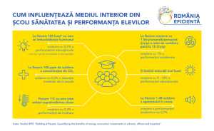 De pildă, modelările derulate de BPIE arată că, într-un interval de temperatură cuprins între 20°C și 32°C, o reducere cu 1°C a temperaturii din clădire crește performanța de învățare a elevului cu 2,3%. Reducerea concentrației de CO2 din interior cu câte 100 ppm conduce nu doar la diminuarea absențelor medicale, ci și la îmbunătățirea performanței academice cu 3-8%. Totodată, un iluminat natural bun, pe lângă reducerea cererii de energie, poate crește atenția, concentrarea și relaxarea, conducând la o performanță școlară îmbunătățită cu până la 18%.