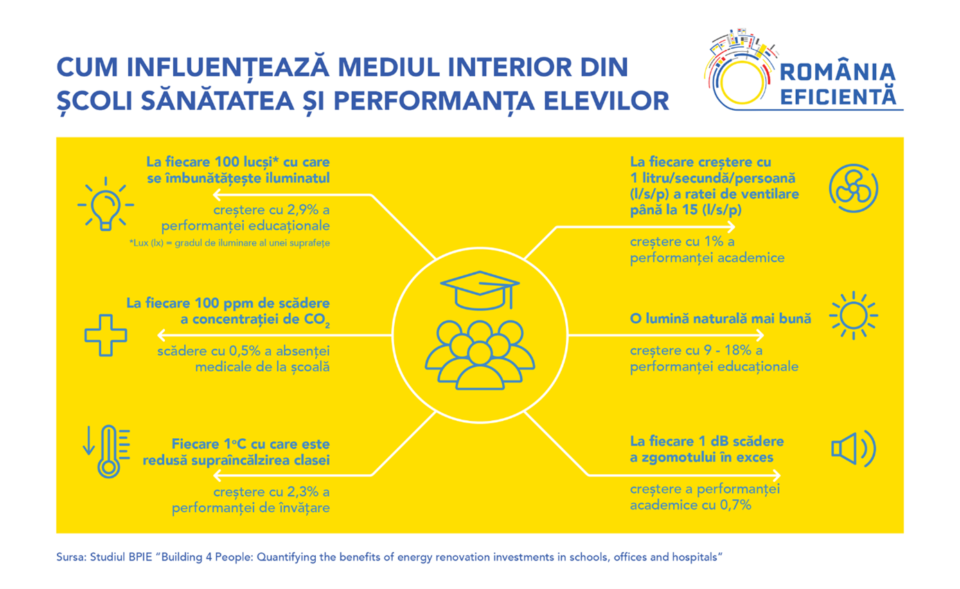 Un infografic realizat de România Eficientă pe baza datelor Institutului European pentru Performanţa Clădirilor (BPIE) sintetizează cât de importante sunt condițiile mediului interior pentru sănătatea și performanța copiilor: