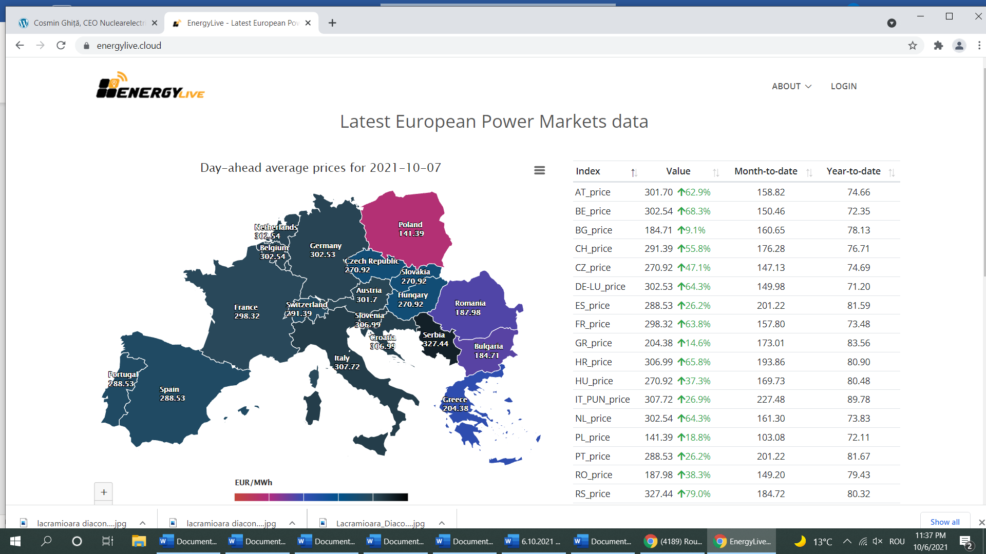 Pentru data de 7 octombrie, piețele spot europene înregistrează noi recorduri. Astfel, cea mai scumpă energie se poate cumpăra în Serbia: 327,44 euro/MWh. Italia, Slovenia și Croația au prețuri de aproximativ 307 euro/MWh, în timp ce în Olanda, Belgia, Austria și Germania energia electrică ajunge la 302 euro/MWh. Franța, cu un preț de 298,32 euro/MWh se apropie vertiginos de bariera de300 euro. Doar în trei țări prețurile la electricitate au prețuri care încep cu ”1”: România (187,98 euro/MWh), Bulgaria (184,71 euro/MWh) și Polonia (cea mai ieftină energie, ”numai” 141,39 euro/MWh.