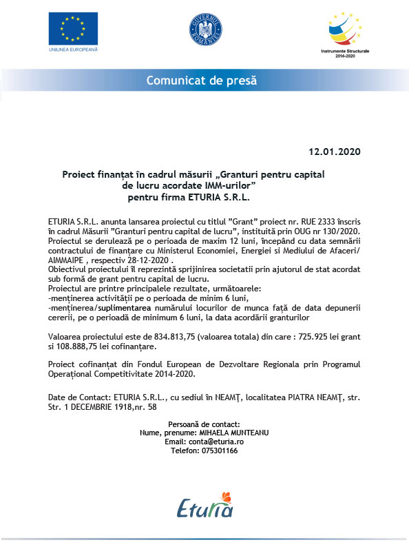 Acasă OFF THE RECORD Proiect finanțat în cadrul măsurii „Granturi pentru capital de lucru acordate IMM-urilor” pentru firma ETURIA S.R.L.