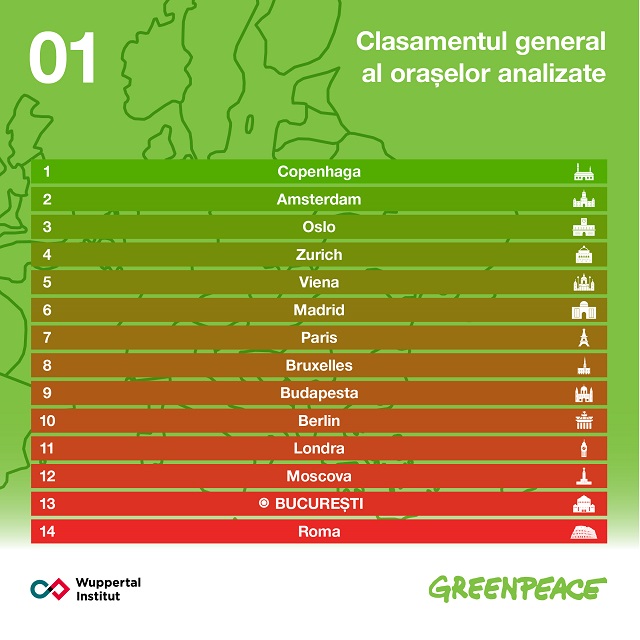 Bucureştiul ocupă penultimul loc în topul a 14 oraşe europene privind mobilitatea durabilă, susține Greenpeace România, potrivit unor date din raportul „Mobilitate durabilă în Bucureşti. O evaluare bazată pe indicatori”, lansat marți de către organizație. Raportul de specialitate reprezintă o completare la clasamentul oraşelor din anul 2018 privind mobilitatea durabilă (Raportul „Living. Moving. Breathing”, realizat de Institutul Wuppertal) în care au fost analizate oraşe europene, precum: Berlin, Londra, Viena, Bruxelles, Moscova, Roma, Zurich, Paris, Amsterdam, Copenhaga, Oslo, Budapesta şi Madrid.