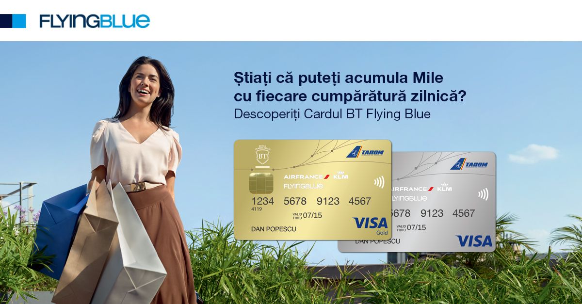 Banca Transilvania, Air France KLM şi TAROM au lansat un produs comun pentru piaţa din România, cardul bancar de călătorii BT Flying Blue. Produsul va aduce utilizatorilor diferite beneficii şi le va permite cu fiecare cumpărătură să câştige Mile Premiu în programul Flying Blue. Cu aceste mile ei vor putea achiziţiona ulterior bilete de avion şi alte produse atractive. Cardul BT Flying Blue este lansat în două versiuni: Classic şi Premium.